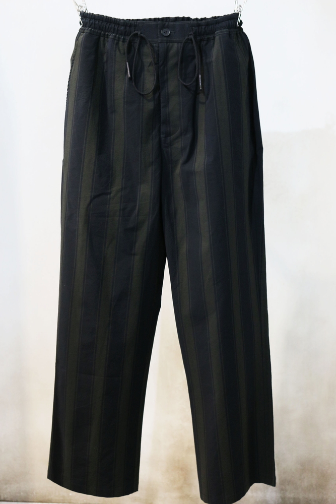 先染めのオリジナルボーダー柄を使用したワイドパンツ。こちらもサラリとした質感で、秋にピッタリな一着です。